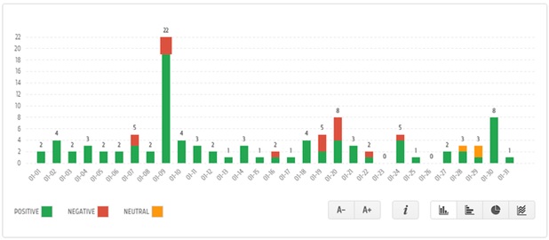 Repare que fomos de um relatório com mais de 5 mil publicações na página (figura 1) para outro com apenas 102 posts e comentários que utilizaram os termos que consideramos relevantes. Agora sim temos uma demanda viável de atendimento. Neste momento, sugerimos iniciar o SAC 2.0 a partir da parte mais crítica: as reclamações, ou seja, todos os posts que foram marcados como negativos. Se você estiver utilizando o Buzzmonitor, clique sobre a linha vermelha do gráfico para visualizá-los.