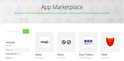 Ao comprar um software de automação de marketing, você verá que a maioria deles oferece integrações com uma variedade de ferramentas de terceiros. Por exemplo, a SharpSpring integra-se com Unbounce, Salesforce, Woocommerce e uma variedade de outras ferramentas que as pessoas usam para gerenciar seus negócios online. Você pode navegar por todas as possibilidades no marketplace de aplicativos: