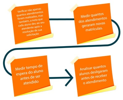 Para medir a qualidade do atendimento é possível aplicar as métricas apresentadas acima. Podem ser instalados em totens coletando o nível de atendimento, ou formulários objetivos que o aluno possa preencher sem ou não anonimamente, de acordo com o desejo do mesmo. Para acompanhar o nível de serviço e taxas de abandono, podem ser usadas “senhas”, assim é possível medir o tempo de espera até o atendimento e a quantidade de senhas retiradas que não estavam presentes, quando chamadas que costumam ser muito usado nas secretarias escolares.