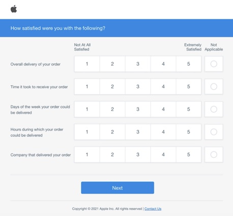 Confira um exemplo de como a Apple faz ao abordar seus clientes nesta pesquisa: