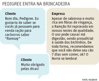 Bom exemplo. Na mesma semana, a marca de ração Pedigree também foi provocada, mas acabou se dando bem. Um internauta mandou uma mensagem para a página da marca no Facebook com um comentário baseado em um episódio da série “Game Of Thrones”, da HBO, em que um personagem foi comido por seus cachorros. A empresa entrou na brincadeira, a resposta viralizou na rede, teve mais de 20 mil curtidas e reações, além de mais de 9.000 compartilhamentos.