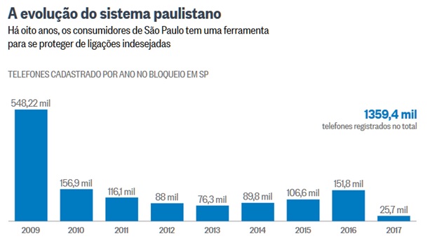 No Estado de São Paulo, o serviço já é realidade. A lei de Bloqueio do Recebimento de Ligações de Telemarketing é de outubro de 2008, foi regulamentada por decreto no final de 2008 e entrou em vigor no início de 2009. Atualmente, há 1.359.358 de números cadastrados. O serviço é administrado pelo Procon-SP: o consumidor cadastra os números de seus telefones no cadastro de bloqueio de ligações de telemarketing no site da autarquia. Após 30 dias, as empresas estarão proibidas de ligar para os números cadastrados.