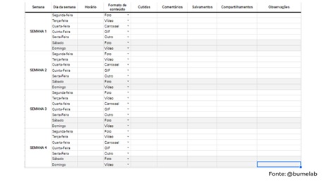 Por meio de uma planilha, registre a semana, o dia da semana e horários em que suas publicações são feitas. Na mesma linha, reserve um espaço para documentar o formato de conteúdo (foto, vídeo, carrossel, GIF e outros) e as quantidades de curtidas, comentários, salvamentos e compartilhamentos.