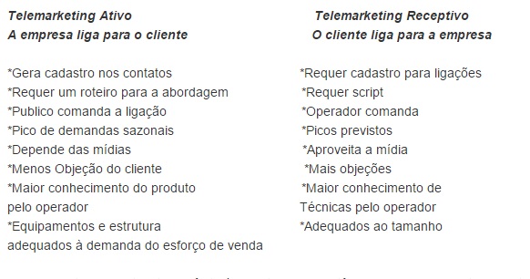 Existem dois tipos de Telemarketing, como mostra o quadro a seguir: