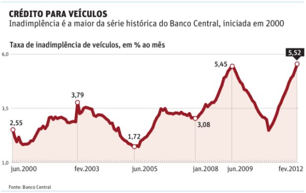 Os sucessivos recordes na venda de veículos no país tiveram reflexo na inadimplência do setor. Em fevereiro, a taxa considerando atrasos acima de 90 dias chegou a 5,52% da carteira de crédito para pessoa física, o maior patamar da série do Banco Central, iniciada em 2000.