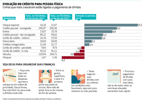 As linhas de crédito cujos saldos mais cresceram nos cinco primeiros meses do ano foram cheque especial (15,3%), empréstimo consignado (descontado na folha de pagamento, que avançou 9,3%), empréstimo pessoal (5,3%) e a rolagem da dívida no cartão de crédito (5%).