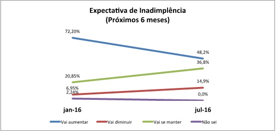 Quando o assunto é inadimplência, por melhor que tenha sido o otimismo do público de Janeiro a Julho, a grande maioria ainda aposta em um aumento da inadimplência para os próximos 6 meses, conforme podemos visualizar no quadro abaixo: