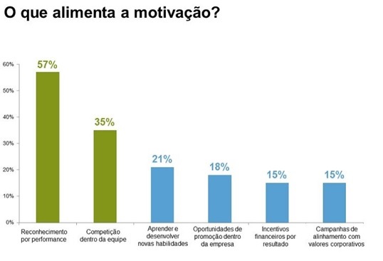 Segundo uma pesquisa realizada pela Aberdeen Research, os principais fatores que alimentam a motivação de profissionais são o reconhecimento pelo desempenho e a competição dentro da equipe, como você pode ver no gráfico abaixo.