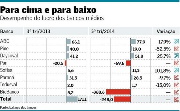 Ainda em fase de reestruturação, BicBanco e Pan fecharam o terceiro trimestre de 2014 no vermelho, com perdas de R$ 368,6 milhões e R$ 69,6 milhões, respectivamente. Bancos Pine, Paraná e Indusval também viram cifras menores na última linha da demonstração. Quem se saiu melhor em meio ao ambiente mais adverso foram ABC Brasil e Daycoval.