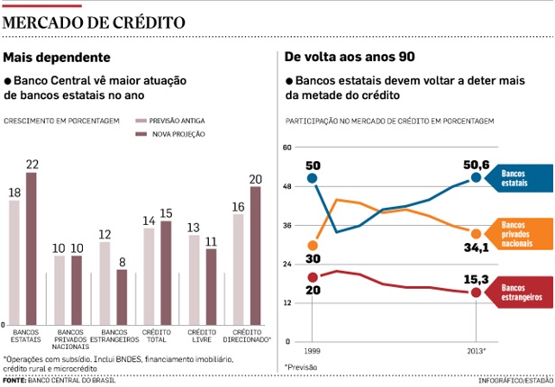A expansão do crédito em 2013 ficará ainda mais dependente dos bancos estatais, que devem terminar o ano respondendo por mais da metade dos empréstimos no País. O fato não acontecia desde 1999. O Banco Central revisou a previsão do aumento do crédito nas instituições públicas este ano de 18% para 22%. É mais que o dobro da expansão de 10% esperada para os bancos privados nacionais, projeção que foi mantida pelo governo.