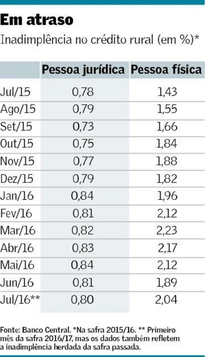 Os problemas climáticos que levaram a perdas de safra em várias regiões do país na temporada 2015/16, encerrada em junho último, também produziram uma escalada da inadimplência na carteira de crédito rural mantida pelos bancos. O índice já alcançou o patamar de 2% para o produtor pessoa física em âmbito nacional, segundo o Banco Central.