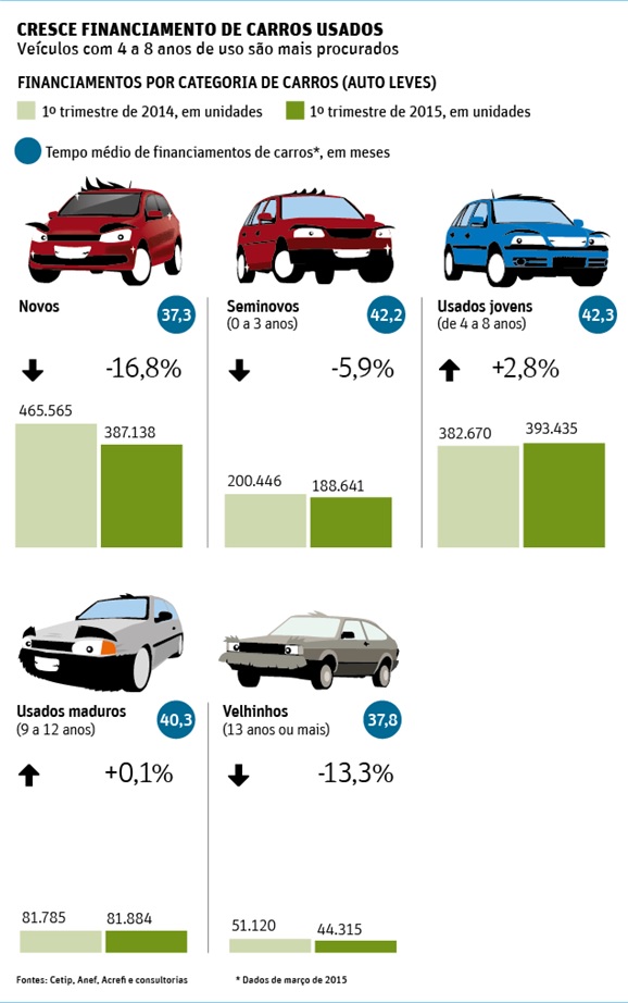 Neste ano, as vendas também crescem em ritmo acelerado. Considerando todas as categorias (seminovos aos mais velhinhos), houve expansão de 2,6% nas vendas no primeiro trimestre ante igual período de 2014. As vendas dos novos despencaram.