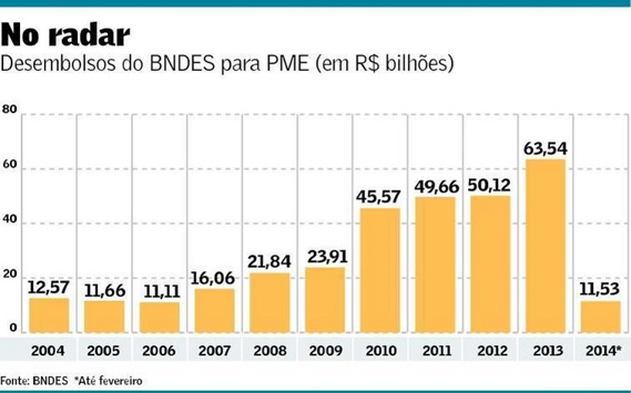 O aumento da participação desse nicho na tomada de recursos fez com que o banco de fomento elegesse os pequenos negócios uma prioridade na nova política operacional, lançada em fevereiro. Os números explicam esse cenário. Os desembolsos totais para esse segmento totalizaram R$ 63,54 bilhões em 2013, um crescimento de 26% na comparação com os R$ 50,12 bilhões do ano anterior. Apenas no ano passado, foram 1,10 milhão de operações. Neste ano, oferta e demanda continuam aquecidas. Apenas no primeiro bimestre, os desembolsos para as PME somaram R$ 11,53 bilhões, alta de 14,98% na comparação com igual período do ano passado. O segmento respondeu por 41% das liberações totais do BNDES no bimestre.