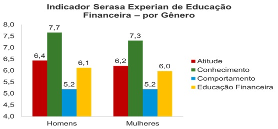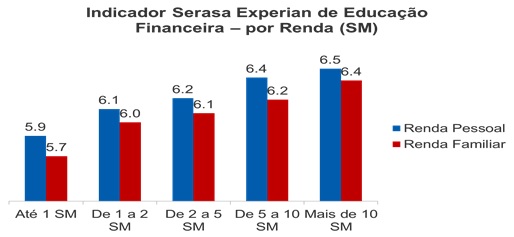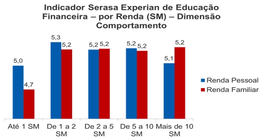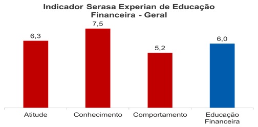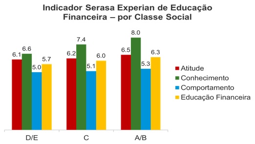 O Indicador Serasa Experian de Educação Financeira do Consumidor apontou média 6,0 para os brasileiros. No subíndice Comportamento, de maior peso no indicador, a nota geral ficou em 5,2. Mostrou que os consumidores que recebem um salário mínimo ou acima de dez salários mínimos empatam neste quesito