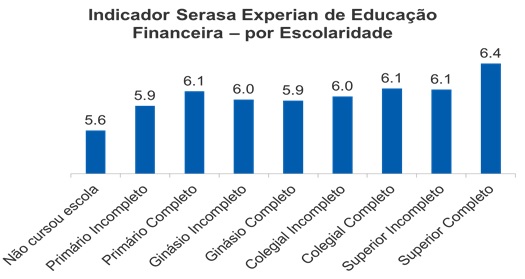 Pessoas com curso superior completo conseguiram nota 6,4 e aquelas sem acesso à escola chegaram a 5,6, mostrando que o grau de escolaridade influencia a relação dos brasileiros com o dinheiro, mas em saltos: o primeiro salto é do analfabetismo/não cursou escola ao curso primário e o segundo salto ocorre com superior completo.