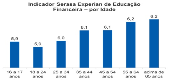 A educação financeira aumenta também com a idade. Jovens de 16 e 17 anos tiveram nota 5,9 enquanto a nota mais alta neste quesito chegou a 6,2 e coube ao grupo de 55 a 64 anos e ao grupo que possui acima de 65 anos.