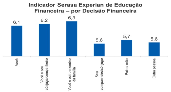O Indicador aponta ainda que as pessoas tendem a ter melhor índice de educação financeira quanto mais pessoas da família estiverem envolvidas nas decisões financeiras. A “nota” do grupo que toma decisão em conjunto com outros membros da família é 6,3.