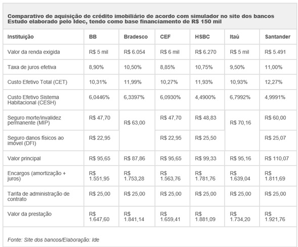 O sistema adotado para a simulação foi o Sistema Financeiro Habitacional (SFH) e o critério de amortização de juros selecionado foi o sistema de amortização constante (SAC). O perfil seria de um comprador com 41 anos de idade, renda mensal de R$ 5 mil, comprando um imóvel novo, cujo valor total seria de R$ 250 mil. O suposto comprador daria R$ 100 mil de entrada e financiaria os R$ 150 mil restantes em 25 anos.