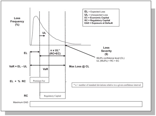 Por fim, em um contexto maior e com uma abordagem mais avançada, ao trabalhar com diversas operações de crédito no portfólio de um banco é possível obter uma distribuição de perdas das operações do portfólio (Figura 1), de onde a Perda Esperada em conjunto com a Perda Inesperada (Unexpected Loss, UL), o Valor em Risco (Value at Risk, VaR) e o Capital Econômico (Economic Capital, EC) são obtidas e utilizadas para analisar o Risco de Crédito do portfólio em diversos detalhes.