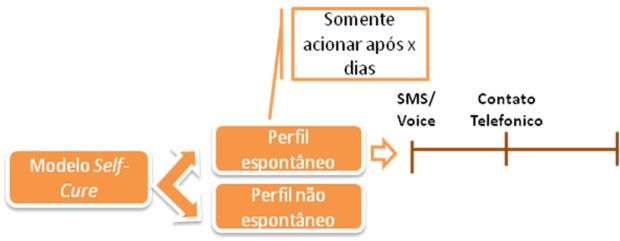 No início da régua, utiliza-se um modelo estatístico chamado de Self-Cure, o que resulta em dois nichos: clientes que possuem perfil de pagamento espontâneo e aqueles que não apresentam esse comportamento. No grupo de perfil espontâneo, caso o cliente não tenha saldado a dívida em um determinado período esperado, o acionamento ocorre após esse período (ponto de corte obtido através de um estudo de cascata de pagamento – pagamento acumulado), primeiramente via canais, e em seguida através de um contato telefônico.