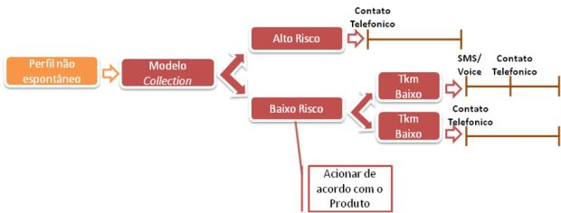 Para aqueles clientes que não possuem o comportamento espontâneo, a pontuação é feita por outro modelo chamado de Collection Score, que aponta o nível de risco desses clientes. Após a identificação do risco, é desenvolvido a forma de atuação. Para os clientes de baixo risco e que possuem um produto de ticket médio baixo, o acionamento é feito inicialmente com canais (voice e sms); já os clientes que possuem um ticket médio alto (financiamento de veículos, por exemplo) são acionados inicialmente via contato telefônico por uma célula apartada, objetivando um poder maior de negociação. Para os clientes que possuem um perfil de alto risco, estes são acionados através de contato telefônico, atribuindo peso máximo na discagem, pois necessitam de uma cobrança mais incisiva por serem clientes menos propensos ao pagamento.