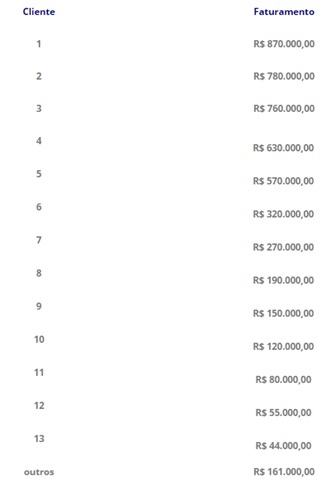 - Os grandes clientes, que vão de R$ 870.000,00 até R$ 580.000,00;