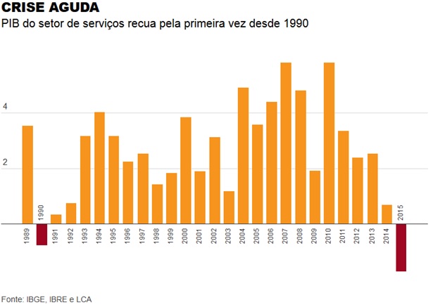 O setor de serviços é dividido em três grandes subsetores: serviços prestados às famílias, às empresas e ao governo. O problema é que todos os segmentos são atingidos pela crise da indústria, pela queda do poder de renda da população e pelo ajuste das contas públicas.