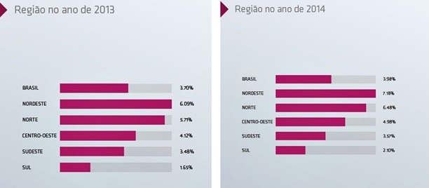 Comparando os dados entre 2013 e 2014, é possível analisar a manutenção de todas as cinco regiões nas mesmas colocações, embora com valores levemente superiores. Enquanto o Nordeste apresentou o maior crescimento, de 6,09% para 7,18%; o Sudeste teve a menor: de 3,48% para 3,57%. A média brasileira, por sua vez, fechou em 3,98%.