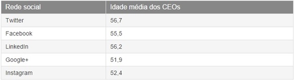 Em média, os executivos “tweetters” são 5 anos mais velhos do que aqueles mantém conta na rede social do Google. Rupert Murdoch, dono da News Corporation, por exemplo, posta regularmente no Twitter e tem 83 anos. Veja na tabela: