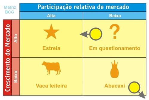 Em uma segunda análise, é preciso posicionar os produtos da empresa dentro da matriz, de acordo com suas características principais, sendo classificados de acordo com o quadrante que ocupam. Os quadrantes são: