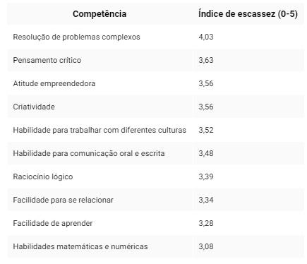 A competência descrita como “resolução de problemas complexos”, que ficou em 1º lugar em termos de escassez na avaliação dos empregadores brasileiros, também foi considerada a mais importante para os profissionais de hoje e dos próximos cinco anos, segundo o Fórum Econômico Mundial.