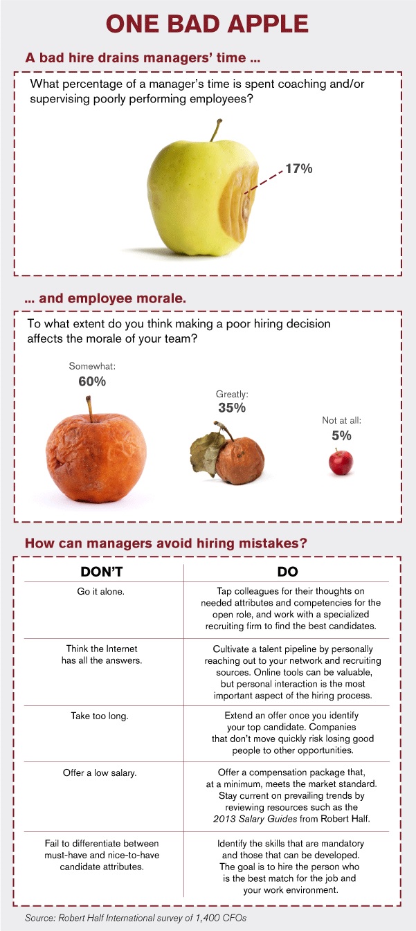 Contratar o candidato errado para uma posição não é só custoso em termos de budget, mas também em produtividade. De acordo com uma pesquisa da Robert Half com CFOs, gerentes perdem 17% do seu tempo (quase um dia por semana!) com a supervisão ou orientação de funcionários de baixo desempenho.