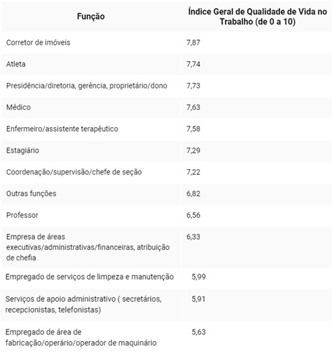 A mesma pesquisa mostra quais os profissionais dizem ter mais qualidade de vida no trabalho, na divisão por área de atuação. Veja o ranking: