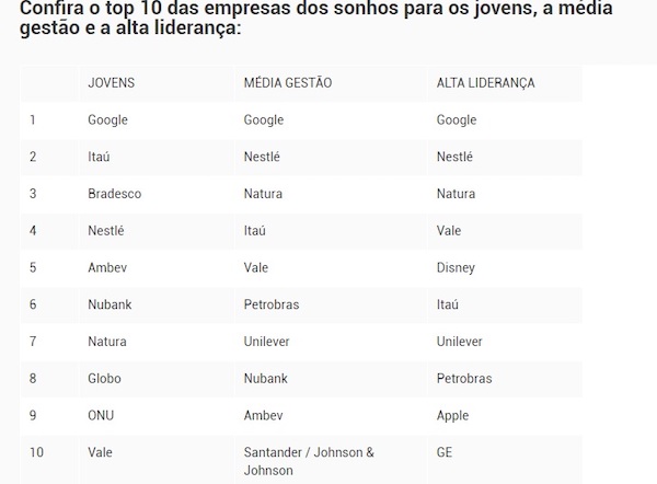 E como o Google encanta a todo o público? Segundo DanilcaGaldini, head de pesquisa da Cia de Talentos, a empresa tem uma marca empregadora sólida e já ocupa um espaço no imaginário das pessoas: de um lugar que apresentar desafios e oportunidades para se desenvolver.