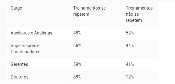 Apesar de considerados úteis por 87% dos colaboradores, os treinamentos parecem ser variações sobre o mesmo tema. Mais da metade dos funcionários acha que os treinamentos são repetitivos: entra ano e sai ano e os mesmos temas são tratados nas capacitações. No entanto, 83% dos decisores diz que isso não ocorre. Quanto mais sênior, maior a sensação de dejà vu nas capacitações oferecidas, segundo a pesquisa: