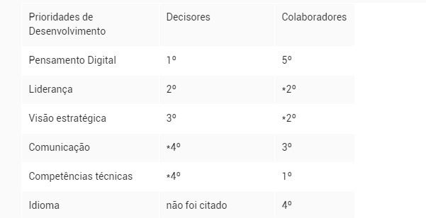 A falta de alinhamento entre decisores e colaboradores é explícita em relação às prioridades de treinamento. De um lado os colaboradores querem treinamentos técnicos em primeiro lugar e do outro os decisores que priorizam o desenvolvimento do pensamento digital, como mostra a tabela: