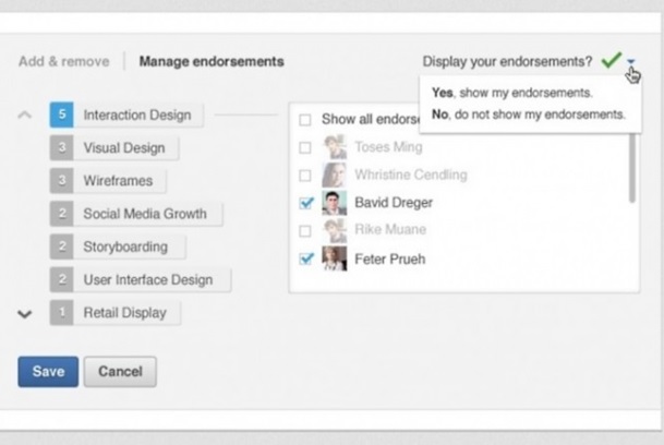 No ano passado o LinkedIn acrescentou a ferramenta ‘Endorsements’ (Recomendar competências) à rede social. Trata-se de um botão de aprovação para que os contatos avaliem as habilidades uns dos outros. Funciona de uma maneira bem simples: basta ir até o perfil de alguém que você deseja avaliar e clicar no sinal positivo (+) ao lado de cada competência listada pelo site.