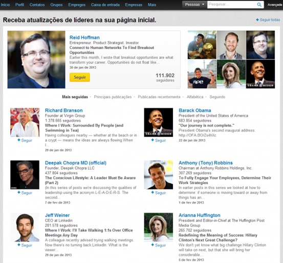 Atualmente o LinkedIn oferece conteúdo original de alguns formadores de opinião de todo o mundo, e permite que você siga essas pessoas, comente diretamente em suas mensagens, compartilhe seus conteúdos com a sua rede, etc.
