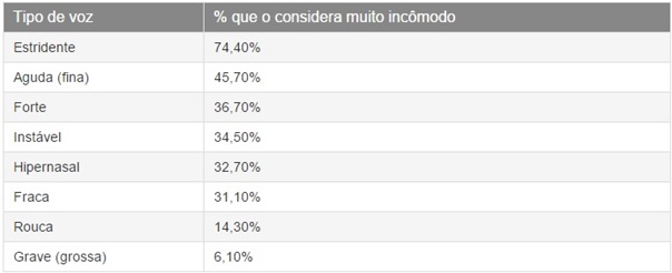 É comum, porém, que algumas características vocais do outro – como timbre, modulação ou intensidade – não agradem. A voz que mais causa incômodo é a estridente, citada por mais de 74% dos entrevistados. Veja a tabela a seguir com os tipos que causam mais irritação: