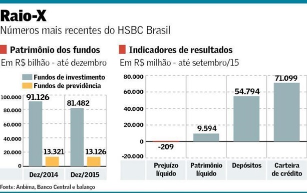O HSBC Brasil ainda não divulgou os números referentes ao quarto trimestre. Em 2014, o banco encerrou o exercício com prejuízo de R$ 549 milhões. Até setembro de 2015, o prejuízo acumulado era de R$ 209 milhões. A carteira de crédito cresceu 8,5%, a R$ 71,1 bilhões até setembro – no mesmo período, a do Bradesco avançou 15,3% (R$ 434,4 bilhões).