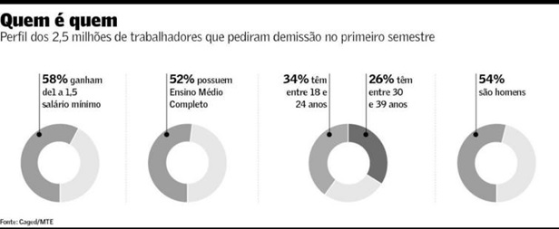Um terço dos trabalhadores que pedem demissão neste ano são jovens (têm de 18 a 24 anos) e 58% deles recebem entre 1 e 1,5 salário mínimo. As histórias de cinco trabalhadores que pediram demissão nos últimos meses sugerem que a crise não acabou com a mobilidade do mercado de trabalho e que os trabalhadores continuam trocando de vagas em busca de melhor salário – seja de imediato, seja como plano para o futuro.