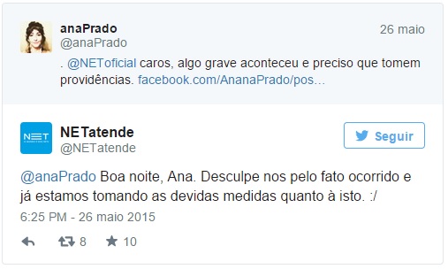 Várias pessoas cobraram respostas da NET na rede social, que respondeu que “o caso da Sra. Ana Prado está sendo tratado com todo o cuidado e seriedade que o assunto exige”.