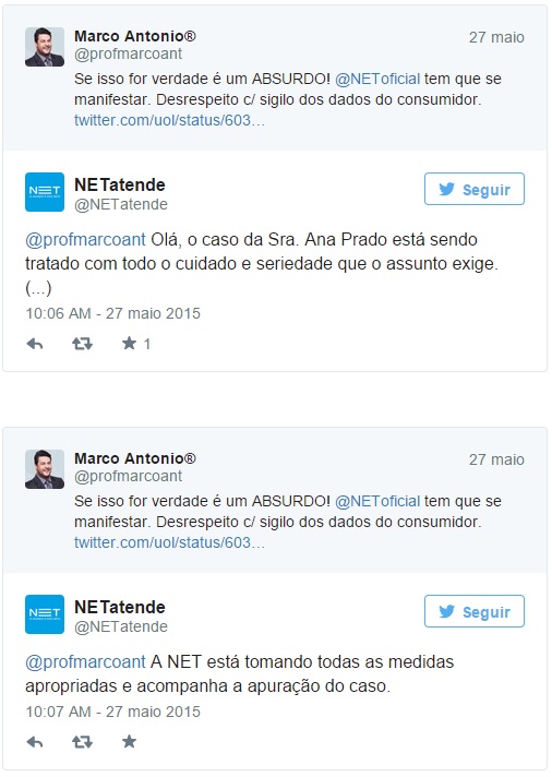 Bárbara dos Anjos afirmou que o mesmo já aconteceu com ela. O funcionário da NET a adicionou e perguntou se era comprometida. “Agora acho que a NET precisa repensar a política de segurança dos dados dos clientes”, disse ela.