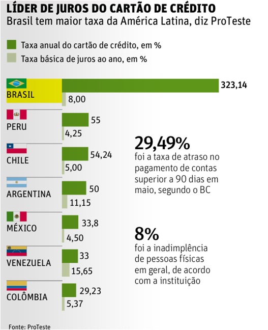 O Brasil tem a maior taxa média de juros do cartão de crédito na comparação com outros seis países da América Latina, mostra pesquisa da ProTeste (associação de defesa do consumidor) divulgada dia 17.