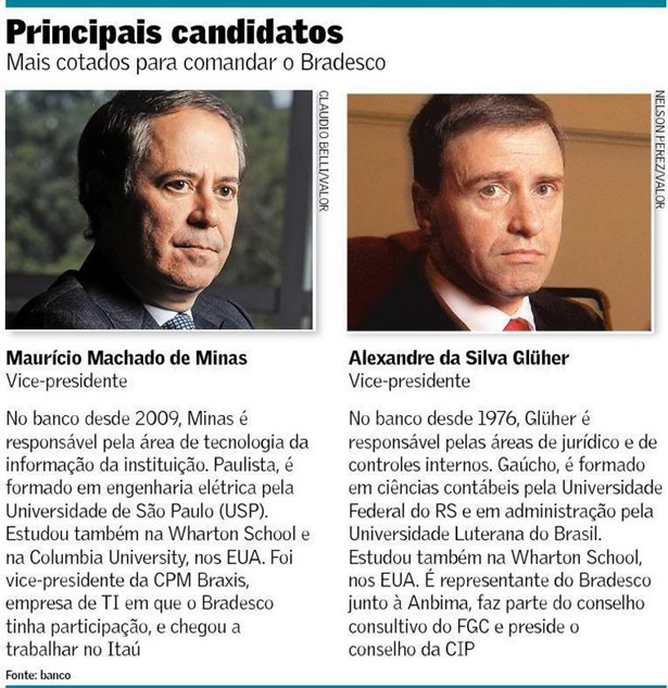 Dois candidatos que eram menos cotados, responsáveis por áreas de apoio do banco, ganharam espaço na disputa e são agora citados como favoritos por executivos da casa. São eles Alexandre da Silva Glüher, vice-presidente executivo responsável pelas áreas de jurídico e controles internos, e Maurício Machado de Minas, também vice-presidente executivo do banco, encarregado da tecnologia da informação da instituição. Entre os dois, Glüher se destaca mais, apurou o Valor, por melhor satisfazer um dos pilares da cultura corporativa do banco da Cidade Deus: o tempo