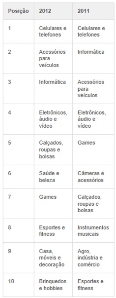 No topo, pouco mudou na comparação entre 2011 e 2012. Depois dos celulares, acessórios para veículos, informática e eletrônicos são as categorias mais aquecidas. A empresa não revela quanto cada uma delas movimenta em dinheiro, mas as quatro são responsáveis por mais de 50% de todas as vendas, proporcionalmente, segundo Helisson Lemos, diretor geral do Mercado Livre no Brasil.