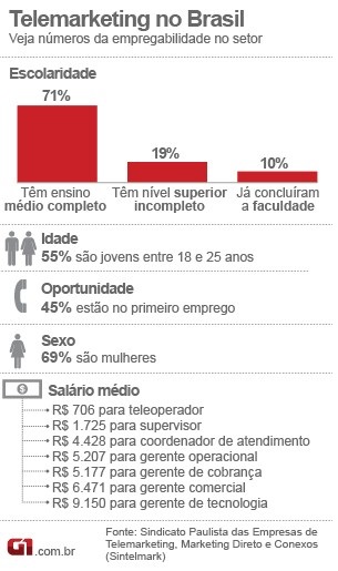 O setor de telemarketing emprega 1,4 milhão de funcionários no Brasil. A maior parte desses trabalhadores é composta de mulheres jovens, no seu primeiro emprego, com ensino médio completo cursado em escola pública. A estimativa do Sindicato Paulista das Empresas de Telemarketing, Marketing Direto e Conexos (Sintelmark) é que o número de empregados mantenha o crescimento anual de 11%, índice parecido ao verificado nos últimos 12 anos.