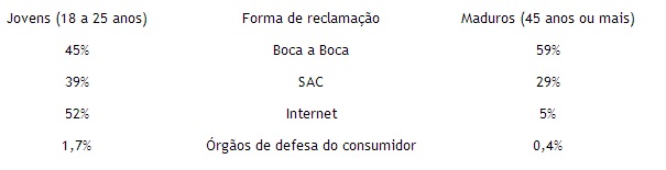 Cerca de 52% dos jovens usam a internet para fazerem suas reclamações junto a empresas. Entre os mais velhos, o uso desse canal cai para 5%, sendo o boca a boca o meio mais utilizado com 59%. Ao todo, das 20,3 milhões de pessoas que fizeram reclamações no mês de julho, 52% utilizaram o boca a boca, 34% os serviços de atendimento ao consumidor (SAC), 29% a internet e 0,8% em órgãos de defesa do consumidor. Os dados são de uma pesquisa do Instituto Data Popular realizada em agosto com duas mil pessoas de 100 cidades de todos os estados.
