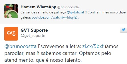 Em resposta, a GVT enviou por Twitter, um tuíte com uma letra de música respondendo o cliente, parodiando a mesma canção.