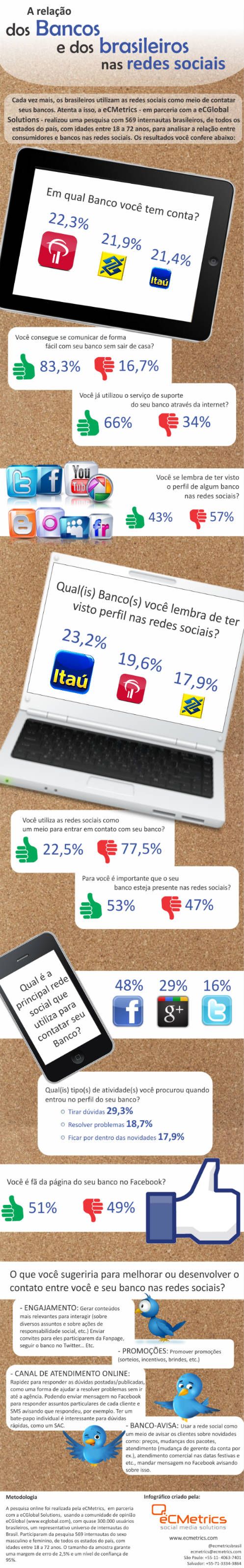 O brasileiro ainda usa muito pouco as redes sociais para entrar em contato com seu banco. Pesquisa realizada pela eCMetrics, em parceria com a eCGlobal Solutions com quase 570 internautas revela que 77,5% dos internautas não usa essas plataformas para falar com as instituições. No entanto, 53% considera que é importante a presença dos bancos nas redes.